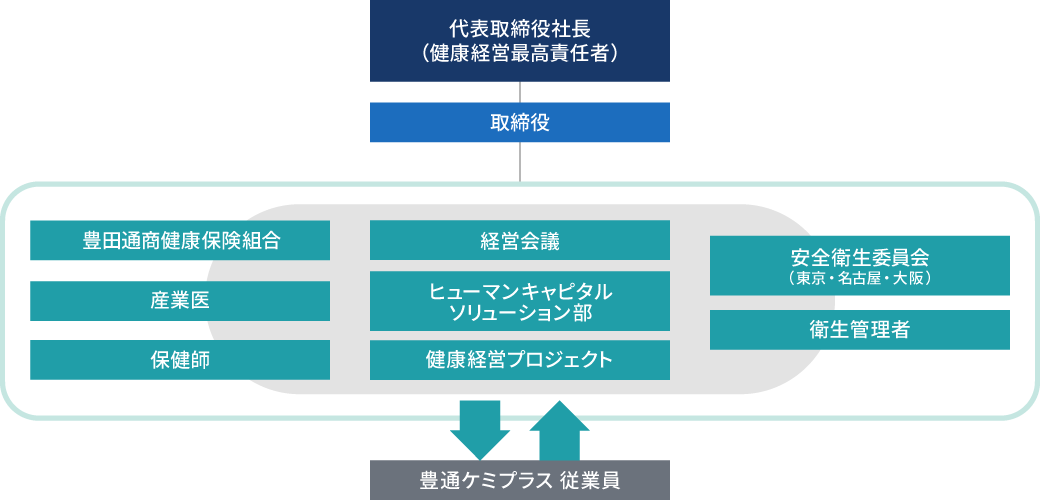その推進にあたり、経営会議、ヒューマンキャピタルソリューション部、専門職(産業医・保健師)、豊田通商健康保険組合、安全衛生委員会との連携や協議を通じて、効果的な施策の実施に努めています。