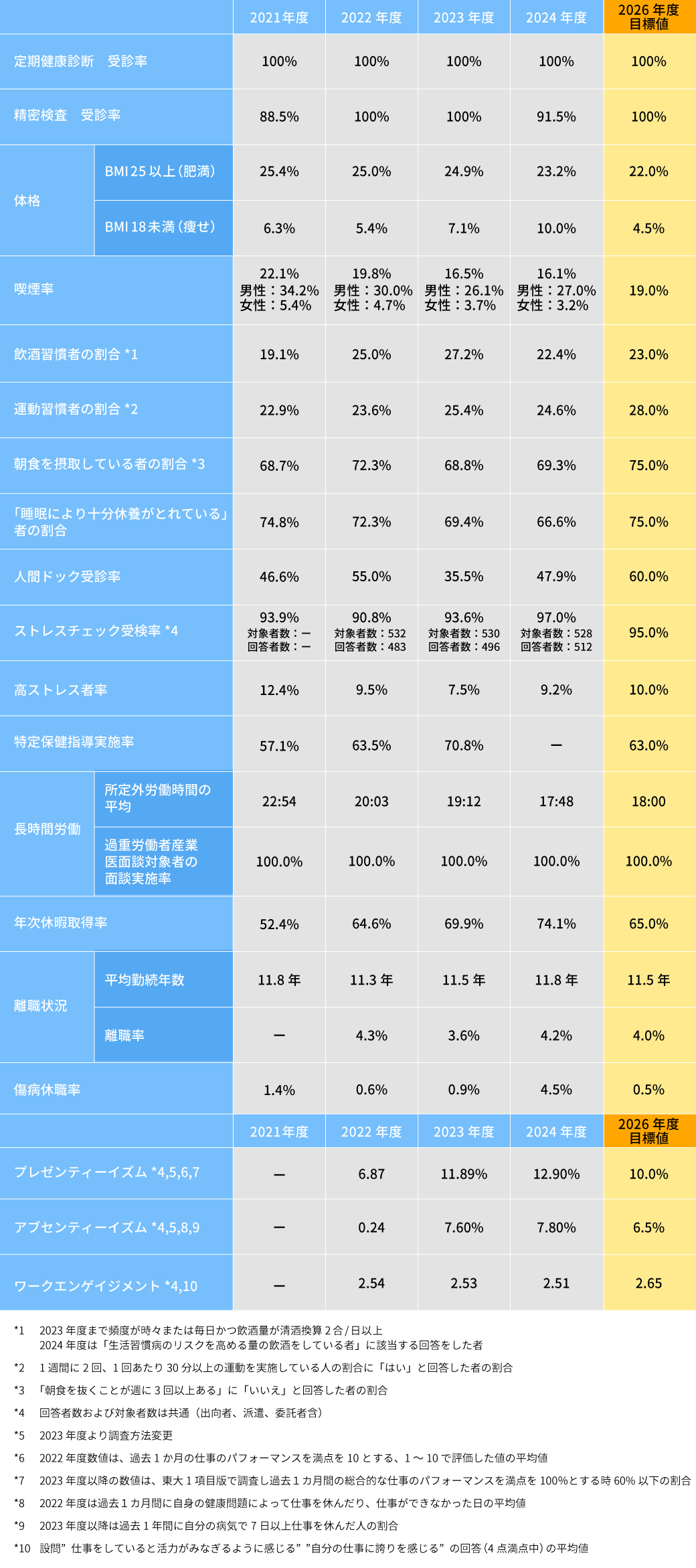 従業員に定期健康診断の受診を義務付けており、受診率は100%を維持しています。生活習慣病などのリスクが高い従業員には医療機関への受診勧奨、保健指導を行っています。