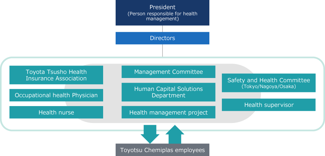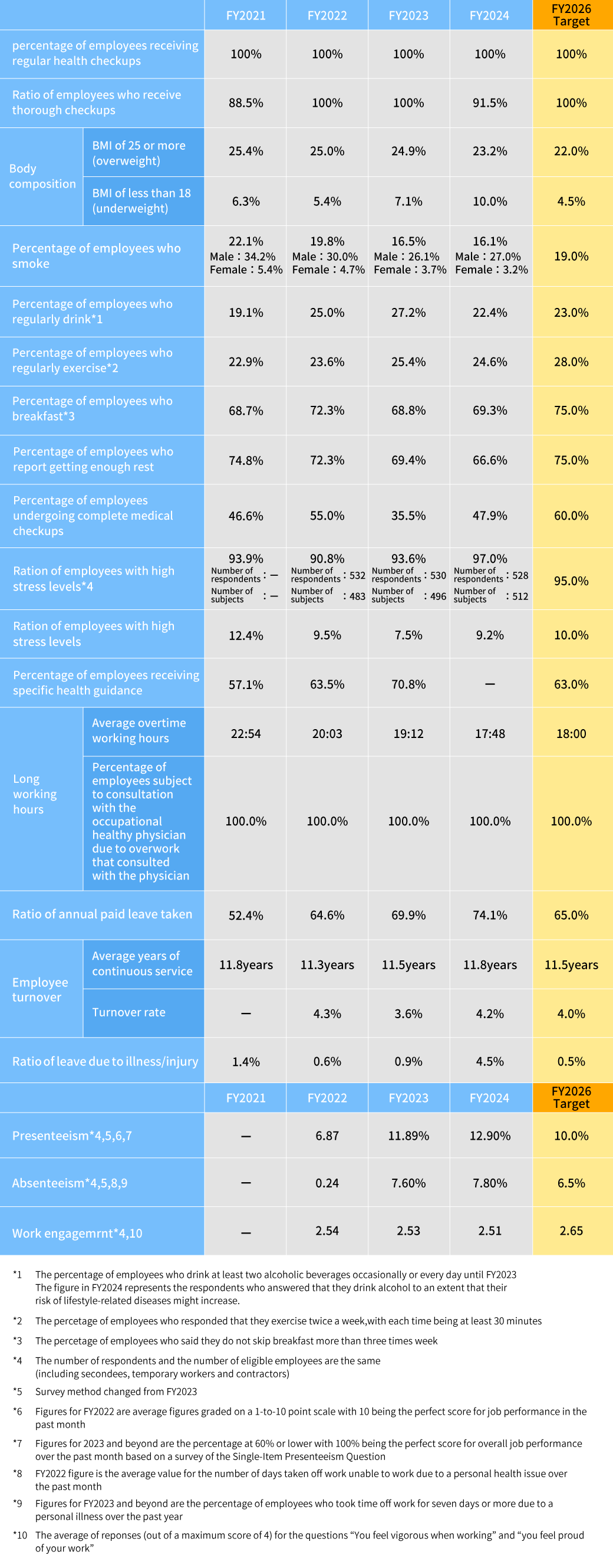 With our president being ultimately responsible for health management, we endeavor to promote health management with the goal of creating a workplace environment where our staff are able to work in good mental and physical health.
